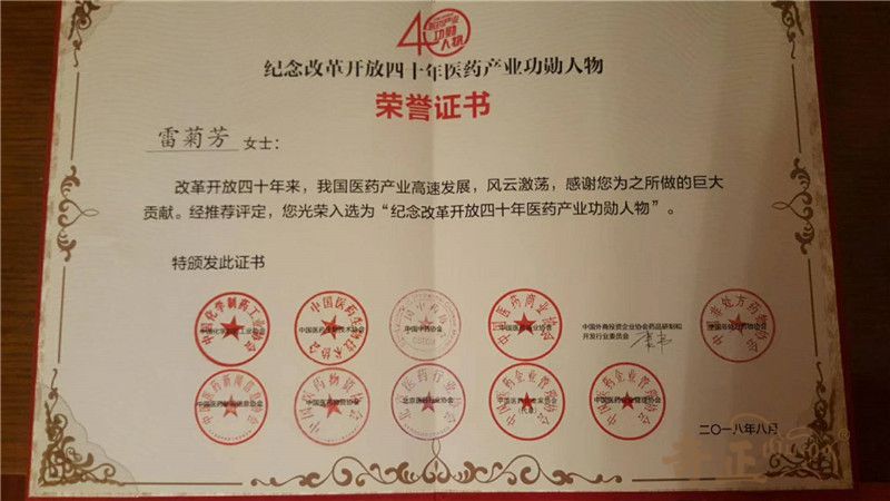 2018年“紀(jì)念改革開(kāi)放40年醫(yī)藥產(chǎn)業(yè)功勛人物“-雷菊芳