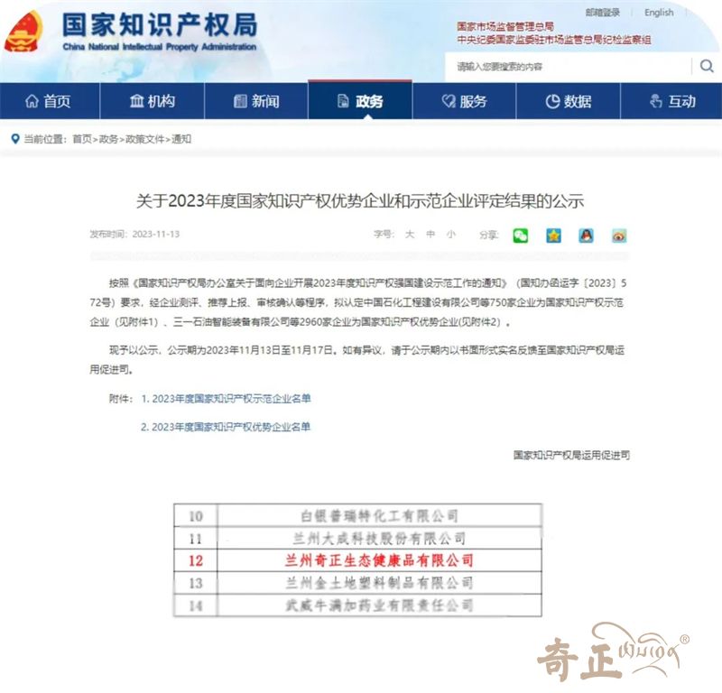 近日,國(guó)家知識(shí)產(chǎn)權(quán)局發(fā)布了《關(guān)于2023年度國(guó)家知識(shí)產(chǎn)權(quán)優(yōu)勢(shì)企業(yè)和示范企業(yè)評(píng)定結(jié)果的公示》,蘭州奇正生態(tài)健康品有限公司(以下簡(jiǎn)稱“奇正健康”)憑借在知識(shí)產(chǎn)權(quán)領(lǐng)域的突出優(yōu)勢(shì),榮膺2023年國(guó)家知識(shí)產(chǎn)權(quán)優(yōu)勢(shì)企業(yè)。