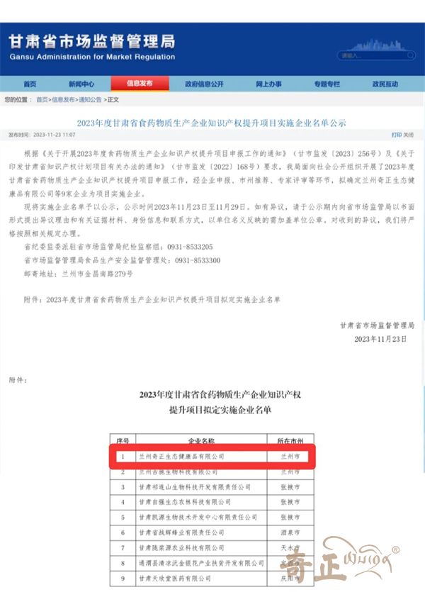 近日,甘肅省市場(chǎng)監(jiān)督管理局公布了2023年度甘肅省食藥物質(zhì)生產(chǎn)企業(yè)知識(shí)產(chǎn)權(quán)提升項(xiàng)目的實(shí)施企業(yè)名單,蘭州奇正生態(tài)健康品有限公司(以下簡(jiǎn)稱“奇正健康”)憑借自身知識(shí)產(chǎn)權(quán)實(shí)力和項(xiàng)目實(shí)施能力,被確定為甘肅省食藥物質(zhì)生產(chǎn)企業(yè)知識(shí)產(chǎn)權(quán)提升項(xiàng)目的實(shí)施企業(yè)。全省僅有9家企業(yè)進(jìn)入實(shí)施企業(yè)名單,目前已完成公示。