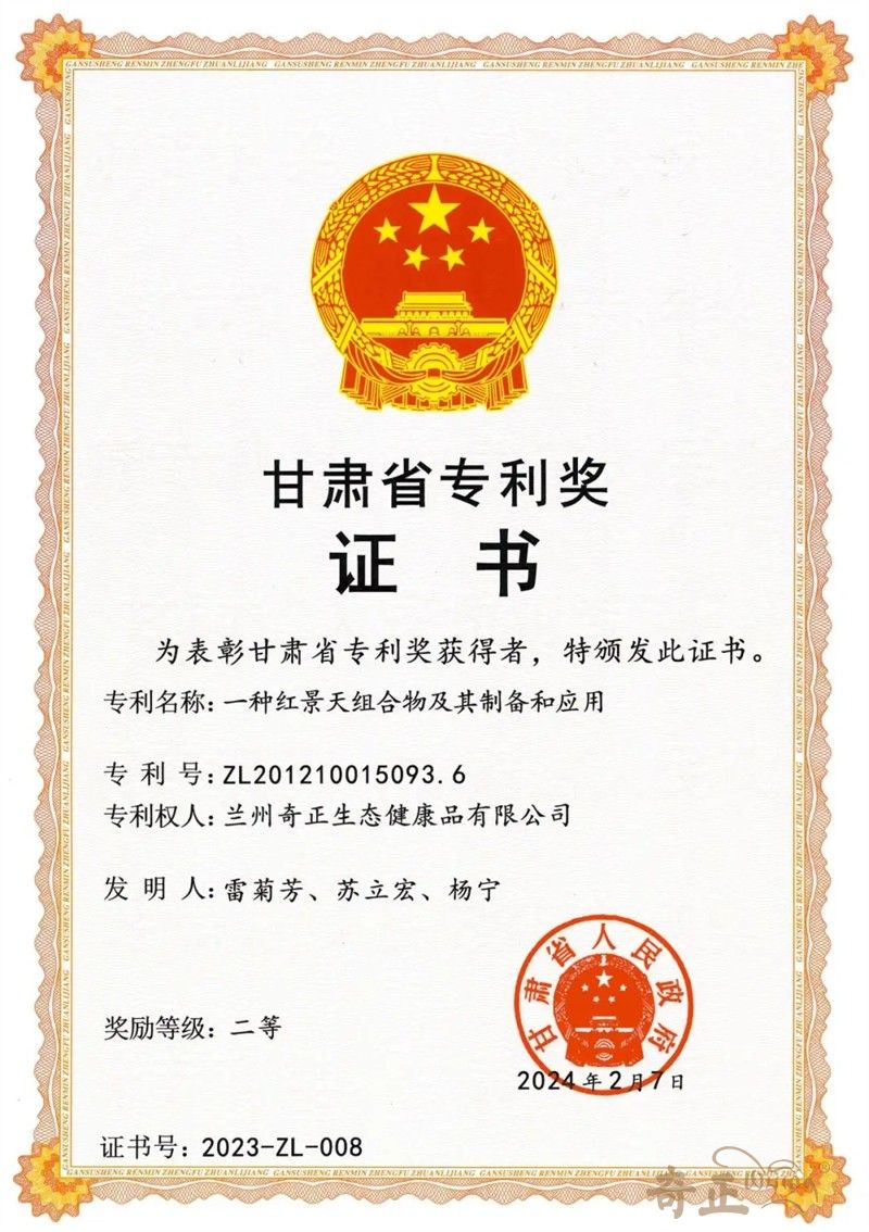2024年2月7日,甘肅省人民政府發(fā)布《關(guān)于2023年度甘肅省專利獎(jiǎng)獎(jiǎng)勵(lì)的決定》,奇正健康發(fā)明專利:“一種紅景天組合物及其制備和應(yīng)用”憑借其獨(dú)特的價(jià)值與技術(shù)優(yōu)勢,在眾多參評項(xiàng)目中脫穎而出,榮獲2023年度甘肅省專利獎(jiǎng)二等獎(jiǎng)。