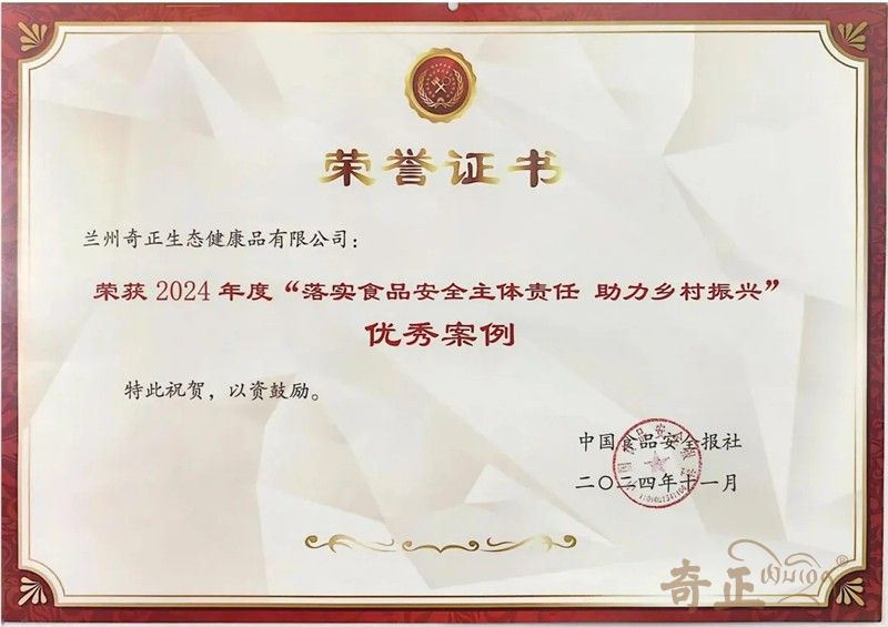 2024年11月3日,第十一屆全國食品安全監(jiān)管信息工作交流大會(huì)暨全國食品產(chǎn)業(yè)高質(zhì)量發(fā)展(甘肅)大會(huì)在蘭州舉行。奇正健康榮獲2024年度“落實(shí)食品安全主體責(zé)任 助力鄉(xiāng)村振興”優(yōu)秀案例。