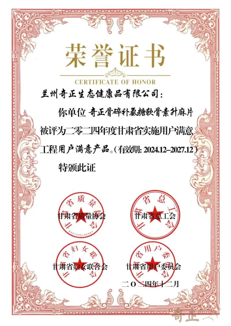 2024年12月,甘肅省質(zhì)量協(xié)會(huì)、甘肅省總工會(huì)、甘肅省婦女聯(lián)合會(huì)及甘肅省用戶委員會(huì)聯(lián)合發(fā)布《2024年度甘肅省實(shí)施用戶滿意工程先進(jìn)單位及個(gè)人的通知》。奇正健康旗下明星產(chǎn)品“奇正?骨碎補(bǔ)氨糖軟骨素升麻片”一舉摘得“用戶滿意產(chǎn)品”榮譽(yù)稱號。這是繼“奇正?紅景天當(dāng)歸人參果百合膠囊”后,奇正健康保健食品再次獲得此項(xiàng)殊榮。該榮譽(yù)的獲得也是對公司產(chǎn)品和服務(wù)的高度認(rèn)可和肯定。